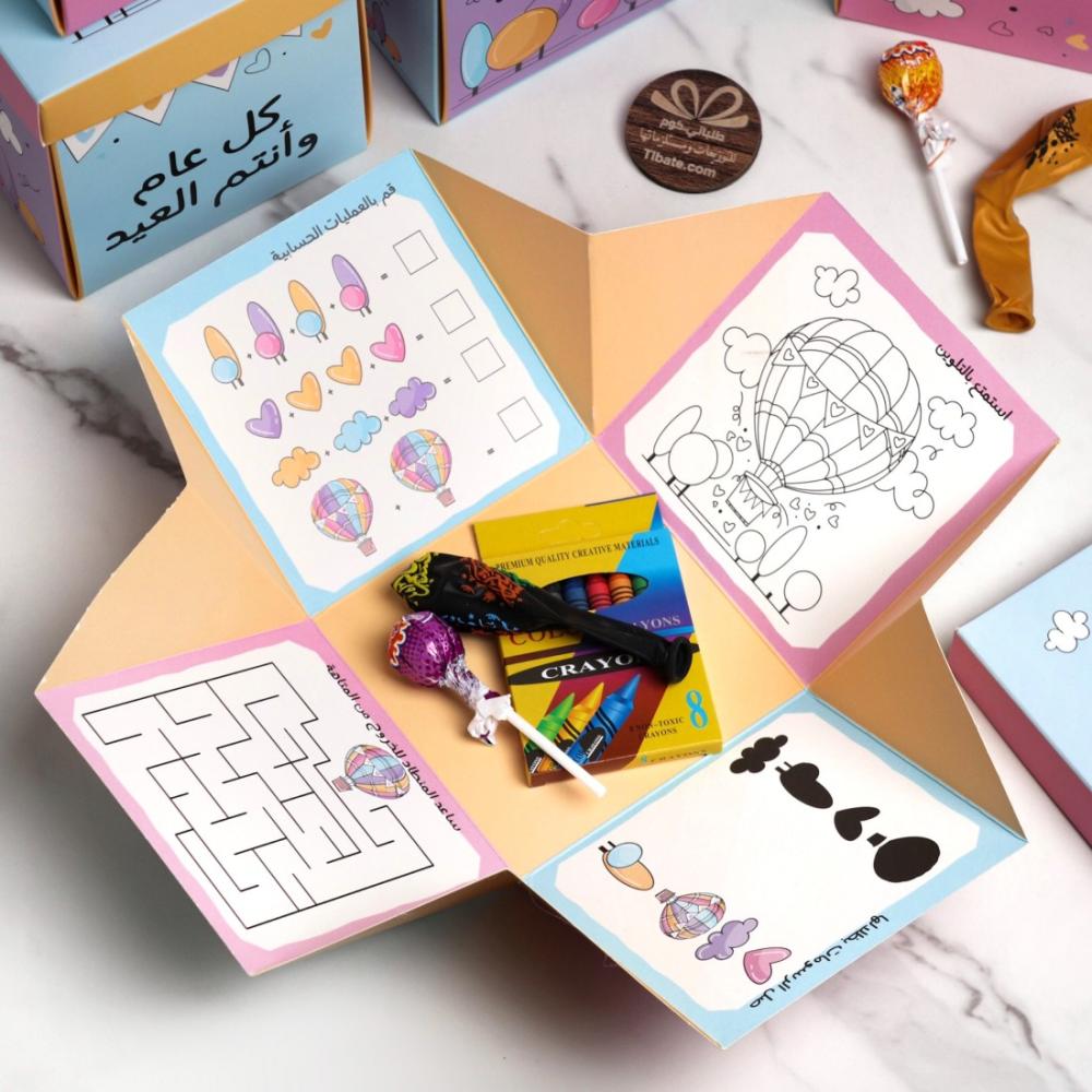 تشمل 4 مساحات لتنمية افكار الطفل والاستمتاع بتلوين المنطاد ومساعدة المنطاد للخروج من المتاهة