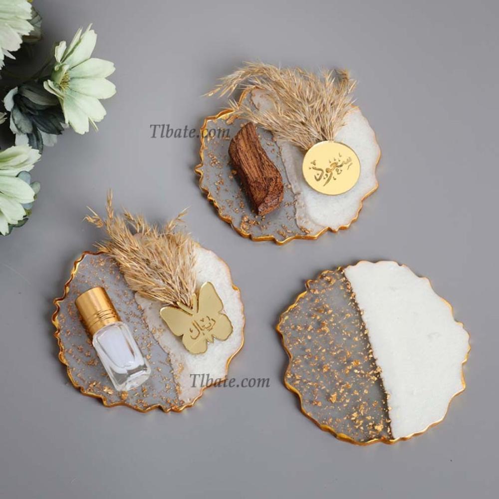 مادة المنتج: ريزن مقاس القاعدة: (10 سم) لون القاعدة: ريزن ذهبية بامكانك إضافة تولة مسك او عود ولوقو اكريليك بالاسم لتكون منسقة و جاهزة للتقديم .