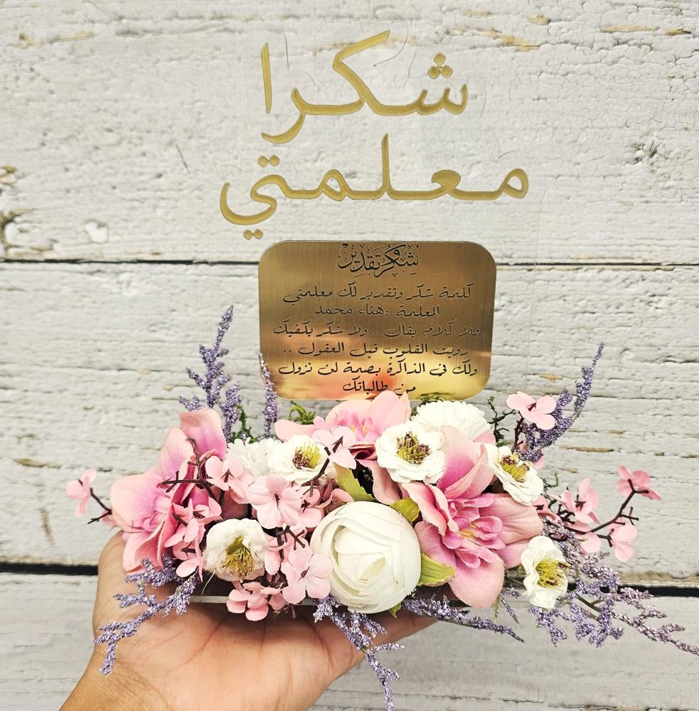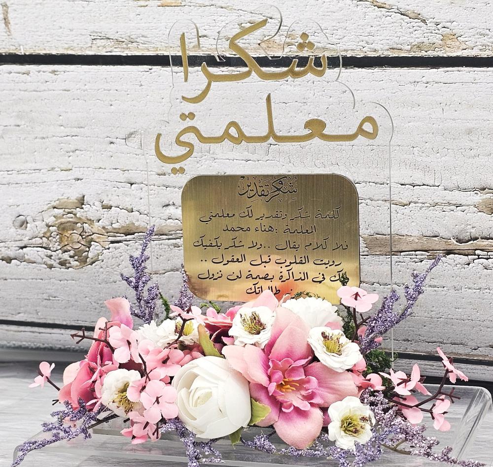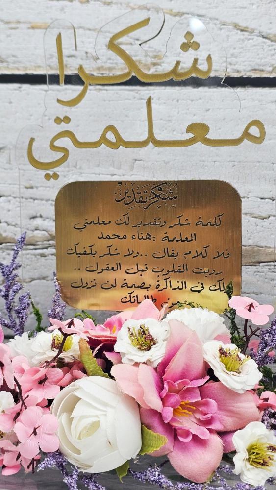 عبّر عن امتنانك وتقديرك للمعلم بطريقة راقية ومميزة مع درع الإهداء الفاخر المصنوع من الأكريليك الشفاف عالي الجودة، والمزيّن بتنسيق أنيق من الورد الصناعي الذي يضفي لمسة من الفخامة والجمال.