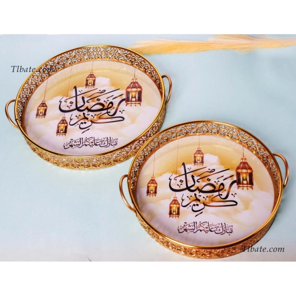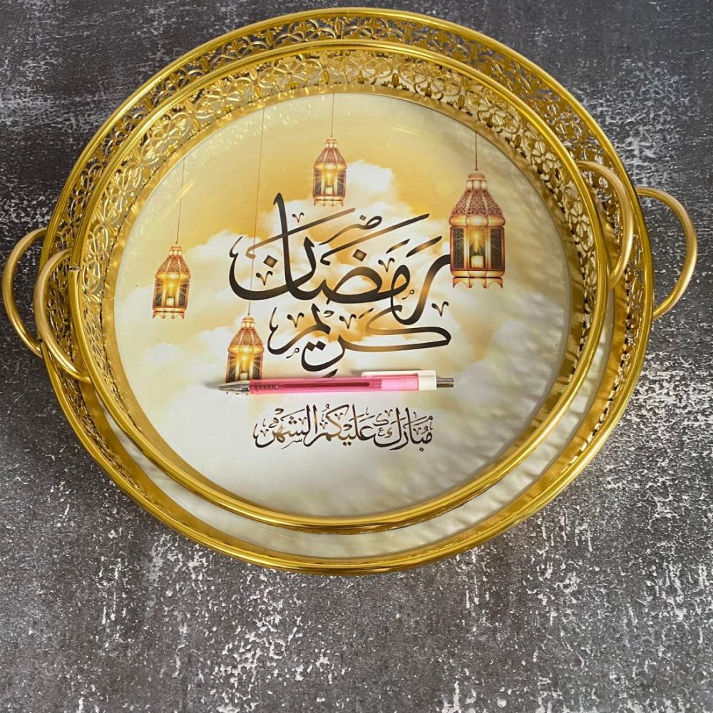 طوفرية رمضانية فاخرة بمسكة يد منقوشة من الاطراف لون ذهبي صينية تقديم بطبقة لامعة عبارة رمضان كريم مقاس الطوفرية الصغير: قطر 30 سم مقاس الطوفرية الكبير: قطر 35 سم يستخدم في تقديمات التوزيعات والمأكولات .