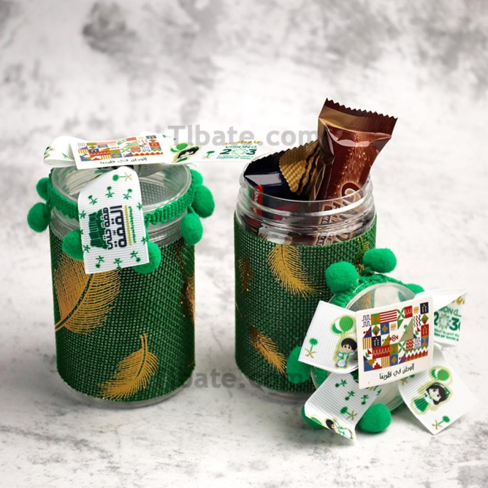 11.73 $علبة توزيعات اليوم الوطني بتغليف قماش وشعار مناسبة لوضع قطع الحلويات والهدايا الصغيرة ارتفاع العلبة: 9سم قطر العلبة: 6سم