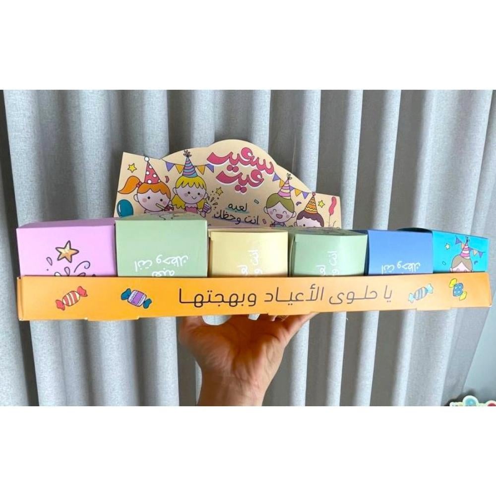 فكرته مبتكرة لتوزيعات العيد يشمل: 24 بوكس ب الوان زاهية تناسب الاطفال بمقاس ( 7*7*7 سم ) ستاند ورقي حامل للبوكسات مادة الصنع : ورق مقوى مقاس المجوعة كاملة :44* 32 سم ملاحظة: المنتج لا يشمل التعبئة