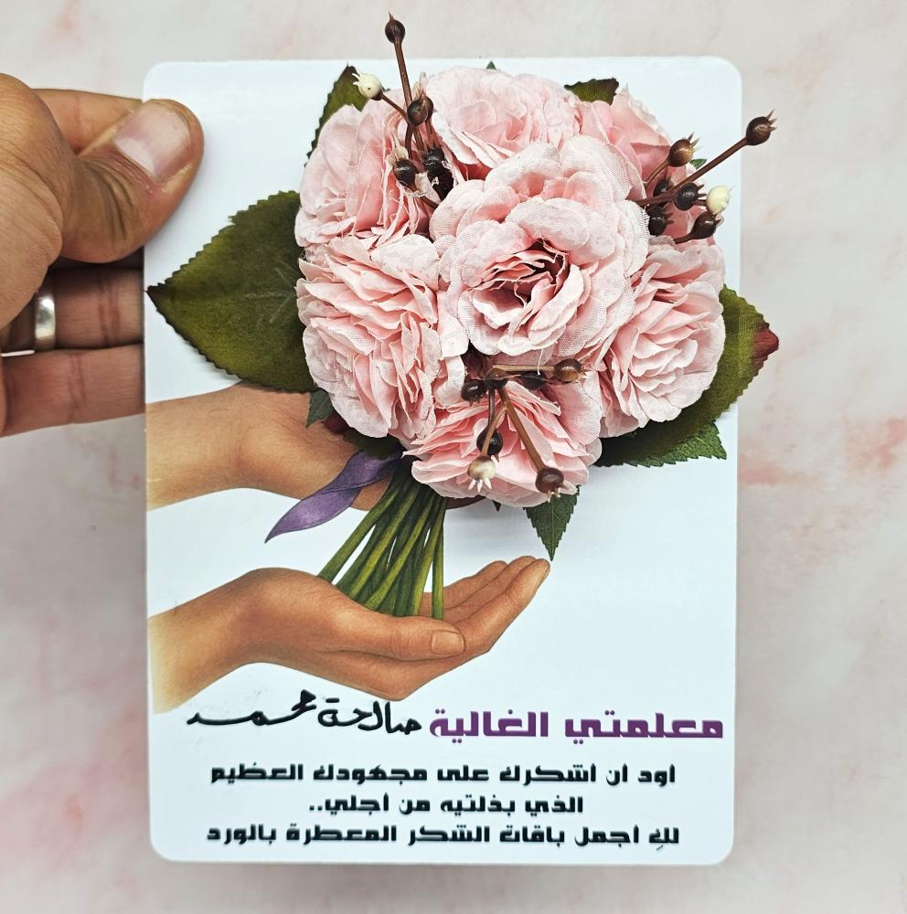 عبّر عن امتنانك لمعلميك بطريقة راقية ومميزة مع كرت شكر مصمم بعناية، يحمل عبارة معبّرة تُلامس القلوب، مرفق بتنسيق أنيق من الورد الصناعي الفاخر.